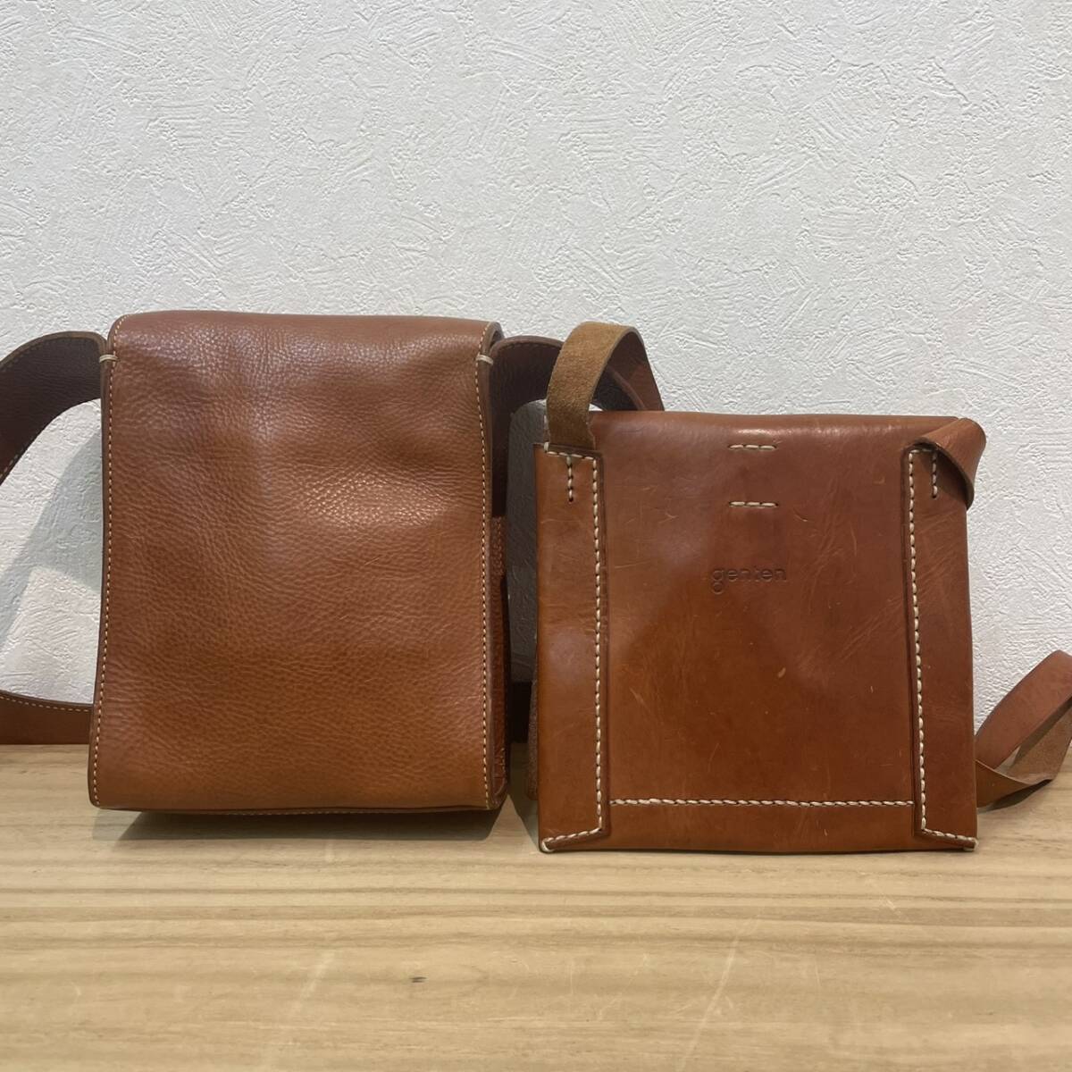 - □上質で高級感ある風合い!! genten ゲンテン レザーミニショルダーバッグ ブラウン2点セット ハンドメイド 高級レザー 【4659YO】J26