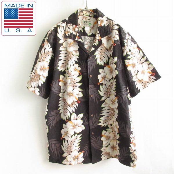 - 美品 USA製 KY'S ハイビスカス ボタニカル柄 半袖 アロハ シャツ XL 黒ベース コットン ビッグサイズ アメリカ製 ハワイ製 D147-04-0017ZVW