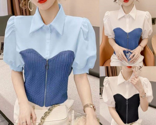 - 【高品質】全3色 半袖シャツ ボリューム袖 切り替え スリム 着痩せ sweet系 フリー 色品番2