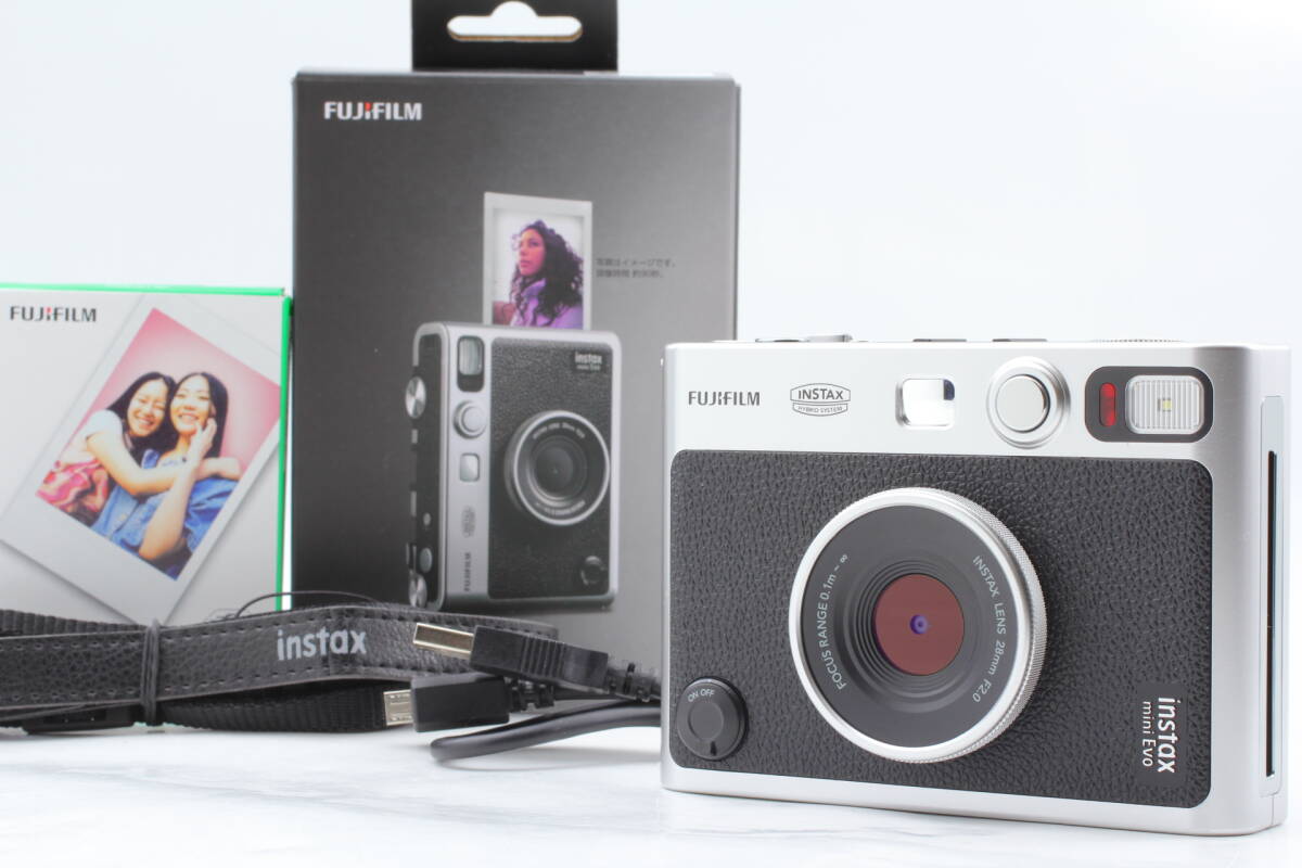 - 【ほぼ未使用】フジフィルム FUJIFILM Instax mini Evo Cheki / 取説 / ストラップ / 接続ケーブル / 新品フィルム / 元箱付