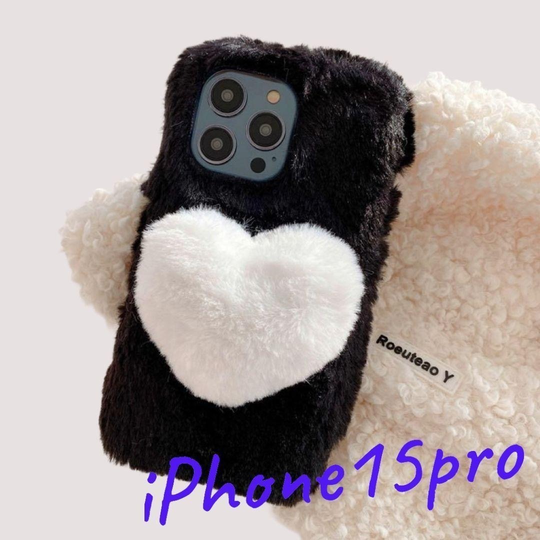 > iPhone15Pro ケース ファー ハート 黒 白 もこもこ 冬仕様
