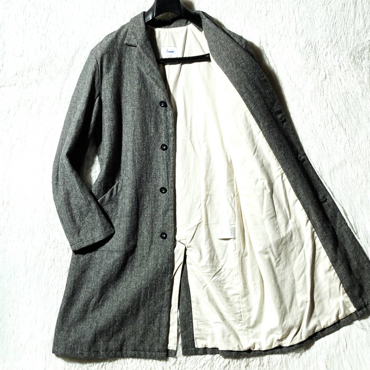 - Yarmo★英国製★リネン混ツイードウール ショップコート チェスター ワークジャケット ロング ヘリンボーン 灰 38 ヤーモ イギリス製 UK