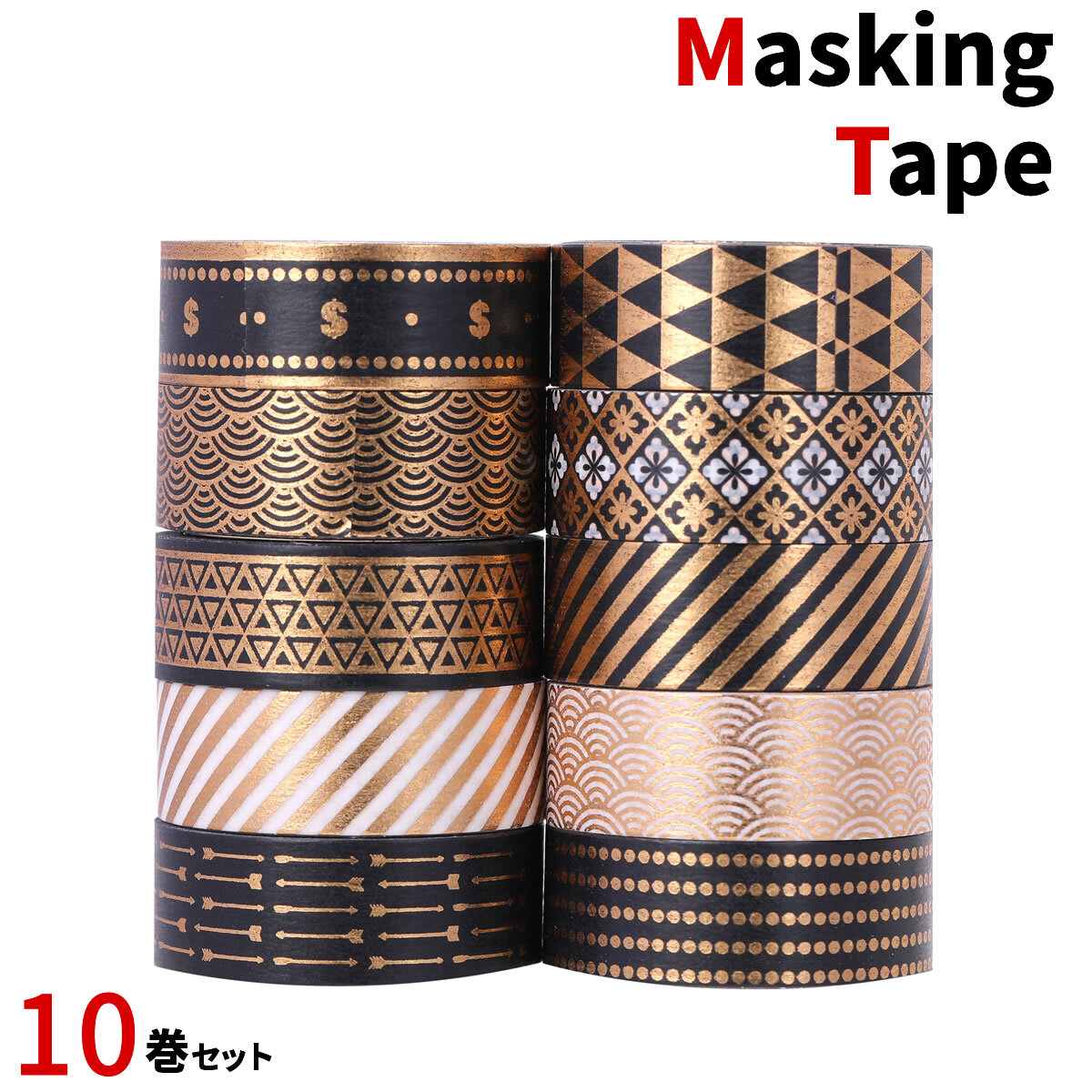 - マスキングテープ ゴールド 10巻セット 15mm×5m マステ 金 黒 ドット シック 高級感 ストライプ 手帳 ラッピング 送料無料 yp