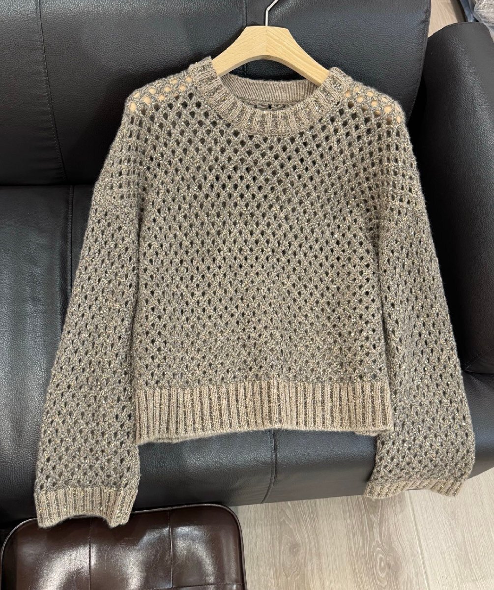 - グレーL★送料無料【新品】★ブルネロクチネリレディースラメ入り メッシュ編み セーター, クルーネック ニット, 長袖 ゆったりシルエット
