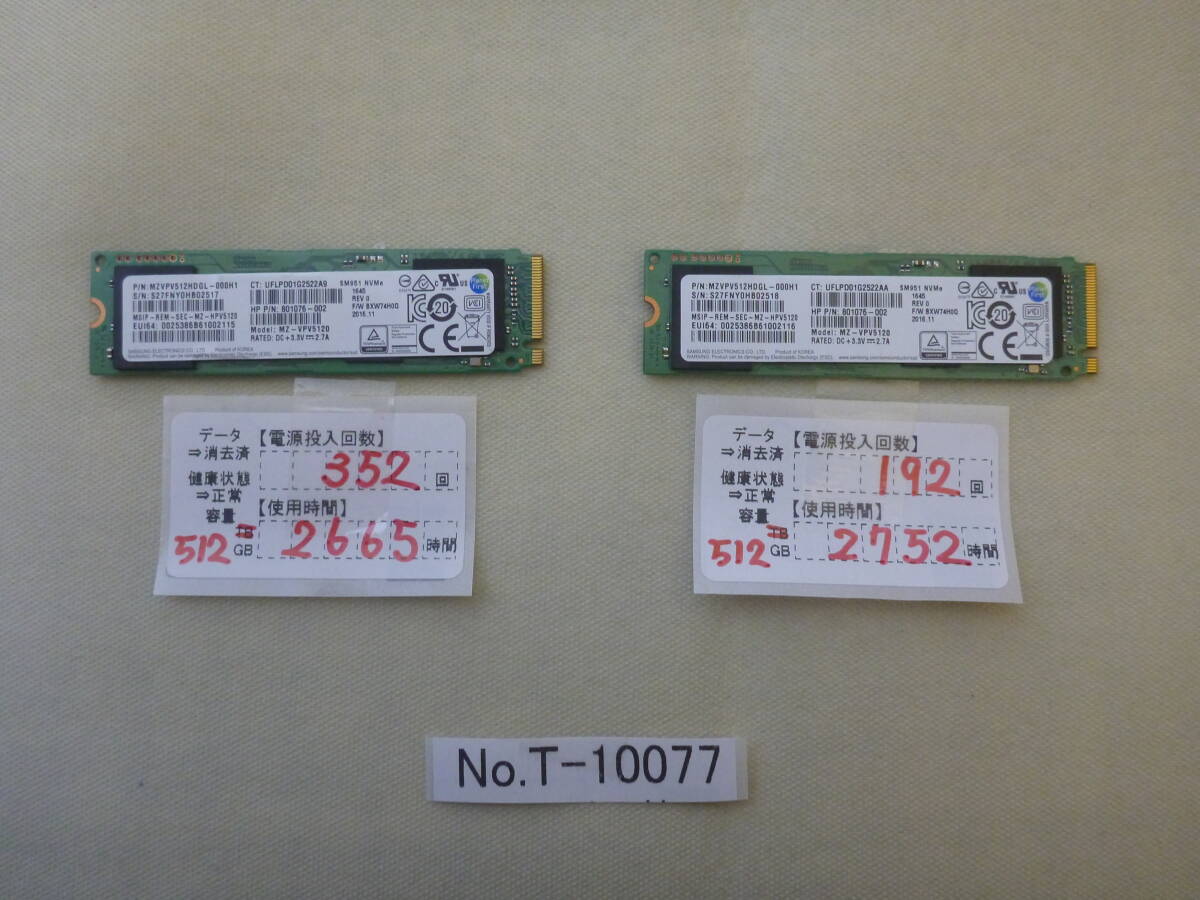 > T-10077 / SSD / SAMSUNG / M.2 2280 / NVMe / 512GB / 2個セット / ゆうパケット / 消去済み / ジャンク扱い