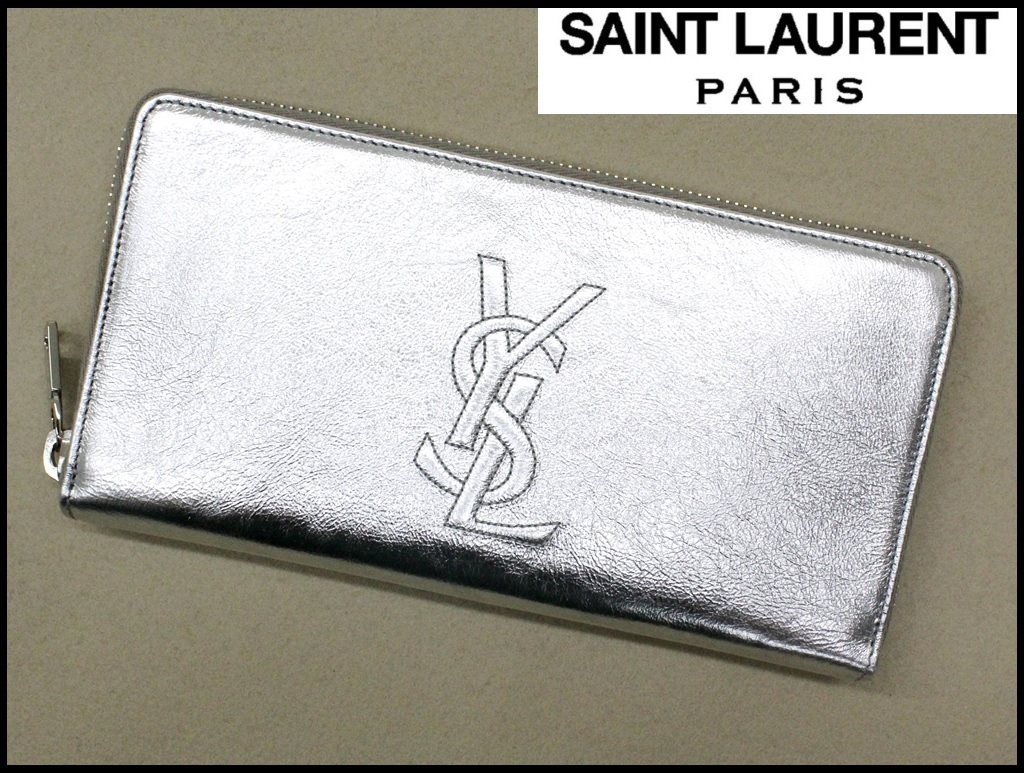 - ●14万新品◆【サンローラン】シルバーレザーYSLステッチラウンドジップ長財布 1円