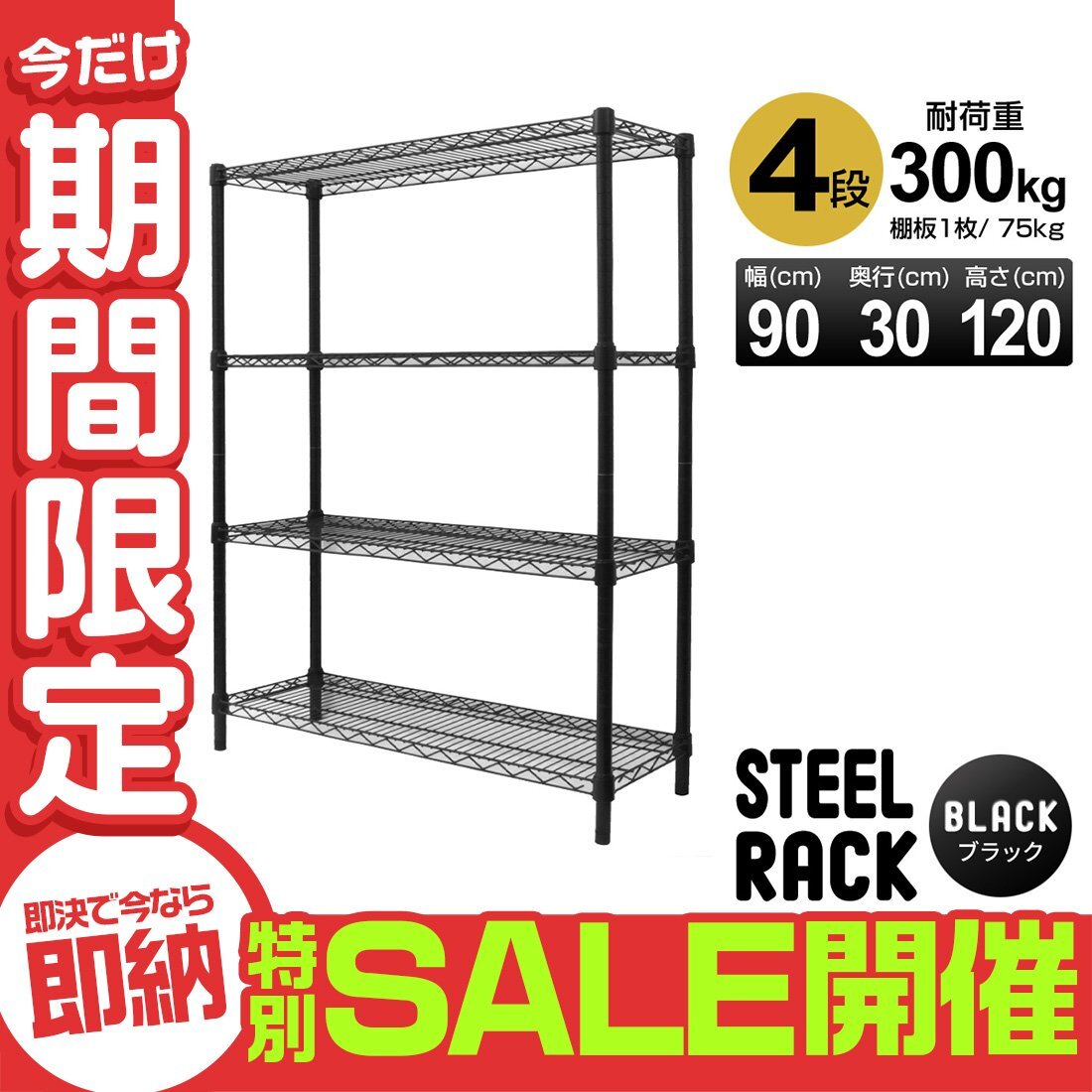 > 【数量限定セール】スチールラック 4段 耐荷重300kg 幅90 メタル製 シェルフ ラック 収納ラック リビング 収納ラック 収納棚 ラック本体