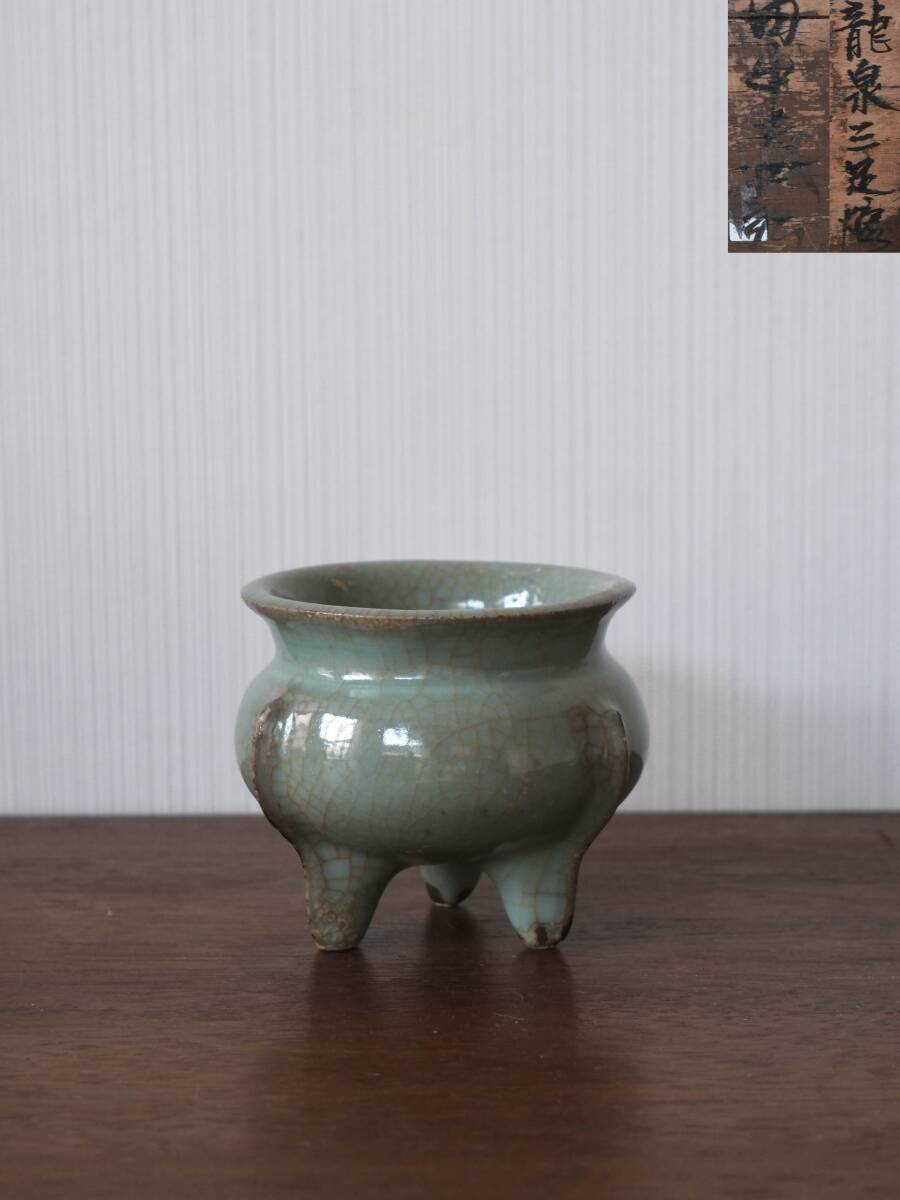 > 【青枠】青磁 龍泉 三足 香炉 香道具 茶道具 陶磁工芸 中国美術 箱付 古道具 時代物 美術品Q2036