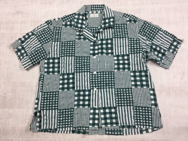 > Connie Luis ストライプ シアサッカー パッチワーク風プリント カントリー オープンカラー半袖チェックシャツ レディース 緑