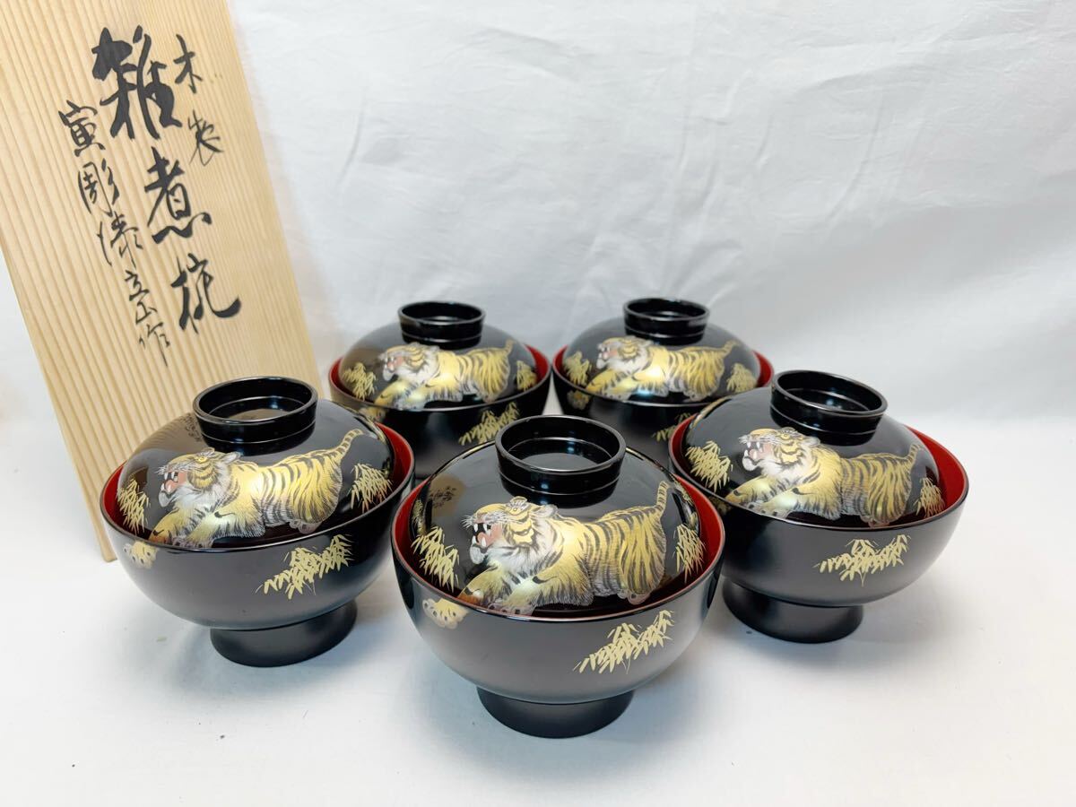 - M704407 未使用 懐石道具 日展作家 冨田立山作 天然木製 黒真塗 寅彫漆 雑煮椀 5客揃 内朱 底刻印 茶懐石 和食器 吸物椀 汁椀 蓋付椀 共箱