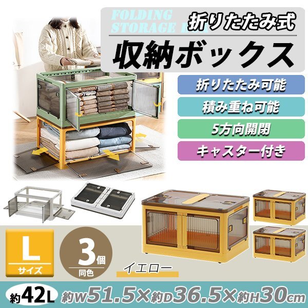 - 送料無料 収納ボックス 折りたたみ 3個セット 約51.5×36.5×30cm Lサイズ 42L イエロー キャスター付き 5面開閉 観音開き 積み重ね