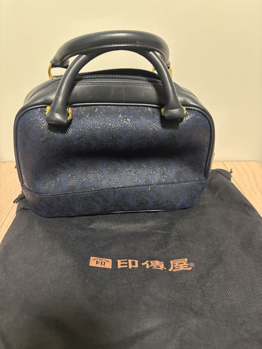 - ●(あ13) ハンドバッグ 印傳屋 INDENYA 花唐草柄 総柄 レザー 濃紺 [60]