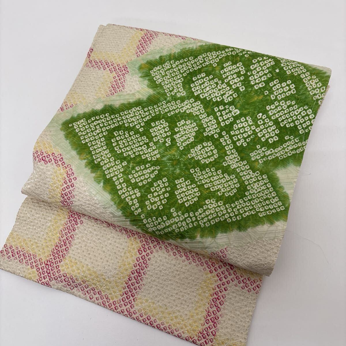 - 名古屋帯 総絞り 格子に菱形 可愛い絞り染め 九寸 正絹 着物 F-940