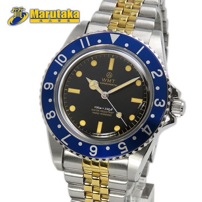 - 送料無料 WMT WATCHES SANFORD ヴィンテージ風 メンズ ウォッチ 黒文字盤 青ベゼル 自動巻 腕時計 SS 逸品質屋 丸高 71-0040
