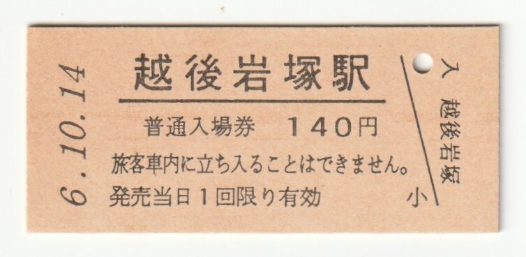 - 平成6年10月14日 信越本線 越後岩塚駅 140円硬券普通入場券(日付印刷)