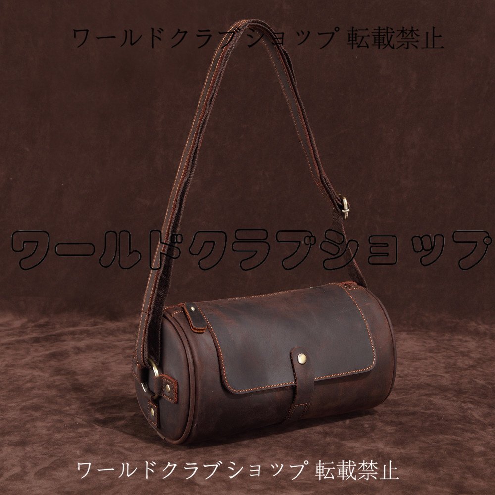 - メンズ 本革 牛革 ショルダーバッグ メッセンジャーバッグ 筒型 ヨーロッパ風 ヴィンテージ 枕型バッグ 深ブラウン フルグレインレザー