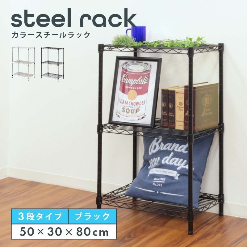 - スチールラック 幅50×奥行30×高さ80cm 3段 耐荷重150kg 高さ調節可能 キッチン リビング カラーラック シェルフ 収納棚 ブラック 新品