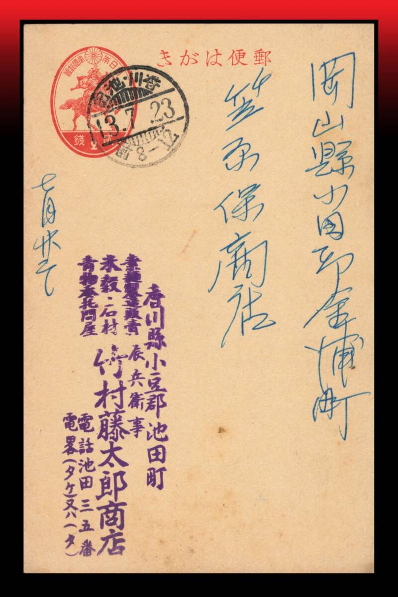 - Z66 離島(小豆島)|新楠公2銭葉書 櫛型印:香川・池田/13.7.23/前8-12 エンタイア