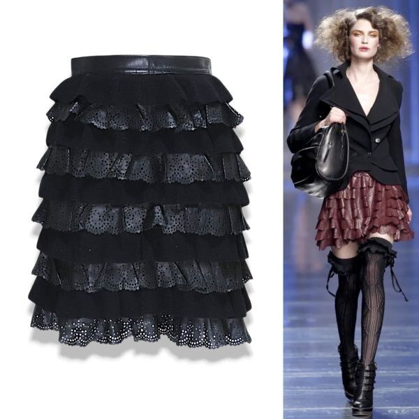 > 良品 ◆超レア◆ 国内正規品 2010 Christian Dior クリスチャン ディオール John Galliano ガリアーノ ニット × レザー フリル スカート