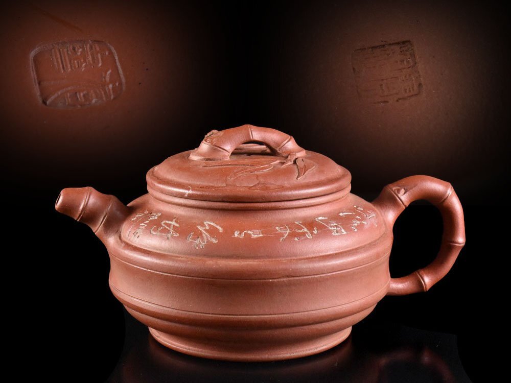 - 【雲】某コレクター買取品 中国古玩 唐物 朱泥漢詩笹彫刻急須 高さ8.3cm 在銘 古美術品(妹紫砂宜興煎茶)CY5003 OTDcgbr