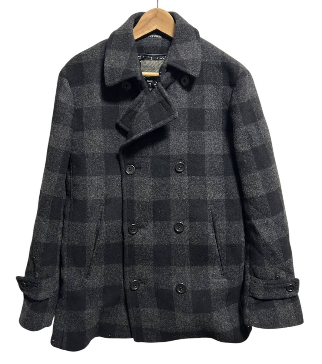 > ▽UNIQLO ユニクロ WOOL COLLECTION チェック Pコート ピーコート M 黒 ブラック グレー ウールコレクション ブロックチェック 中綿入り