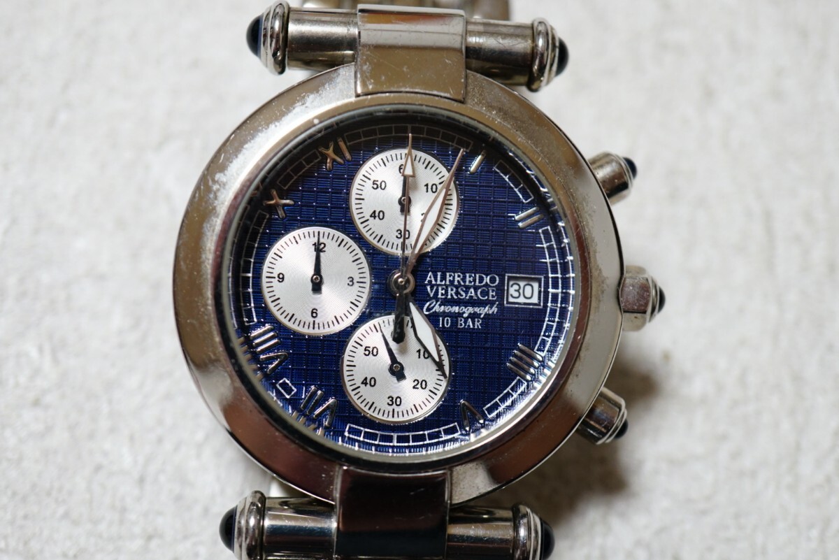 - F2185 ALFREDO VERSACE/アルフレッドヴェルサーチ クロノグラフ 青文字盤 カレンダー メンズ 腕時計 アクセサリー ヴィンテージ 不動品