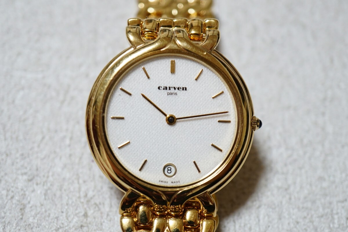 - F2177 carven/カルヴェン PARIS カレンダー ゴールドカラー メンズ 腕時計 アクセサリー ヴィンテージ ブランド SWISS クォーツ 不動品