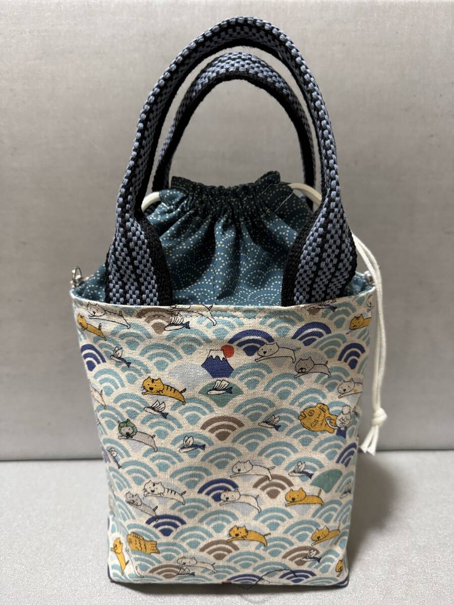 - ハンドメイド 綿麻キャンバス×帆布×シーチング 巾着付きミニミニトートバッグ 猫 / 和柄 青海波 ねこ ネコ 猫柄 WAGARA