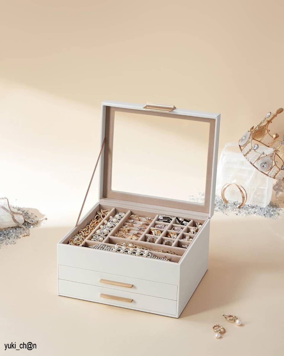 - ジュエリーボックス アクセサリーケース 3段式 ホワイト 大容量 引き出し ネックレス、ブレスレット収納宝石箱 ガラス蓋 母の日ギフト