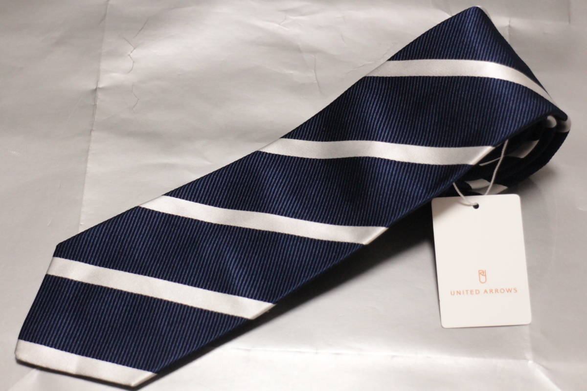> ユナイテッドアローズ新品ネクタイ超艶美麗ネイビー*シルバーレジメンタル重厚レップ織バンカーストライプフルハンドメイド