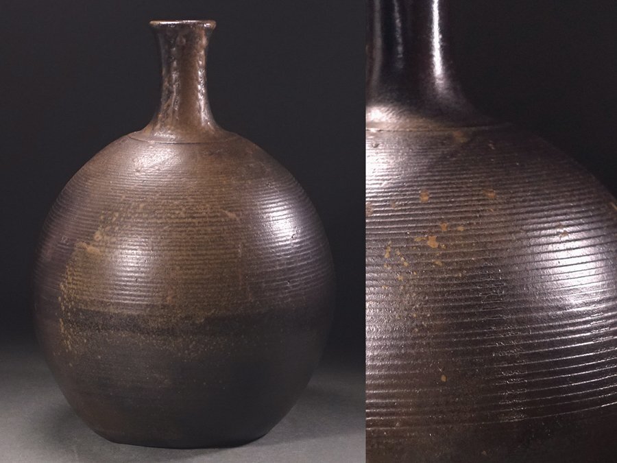 - ∇花∇江戸時代後期~明治期頃 黒備前 伊部手徳利花入 伊部らしい薄手黒褐色の素晴らしい姿 窯印あり