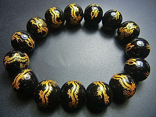 - ★西蔵天珠数珠★JFV3738 黒オニキス 14mm金色「飛龍」彫り 超勧め