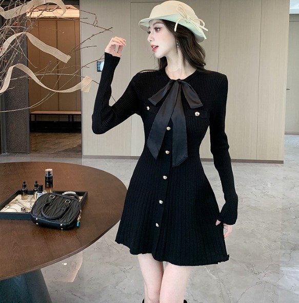 - ショート丈ワンピース ミニワンピース ニット 長袖 フリル リボン シンプル カジュアル きれいめ レディース