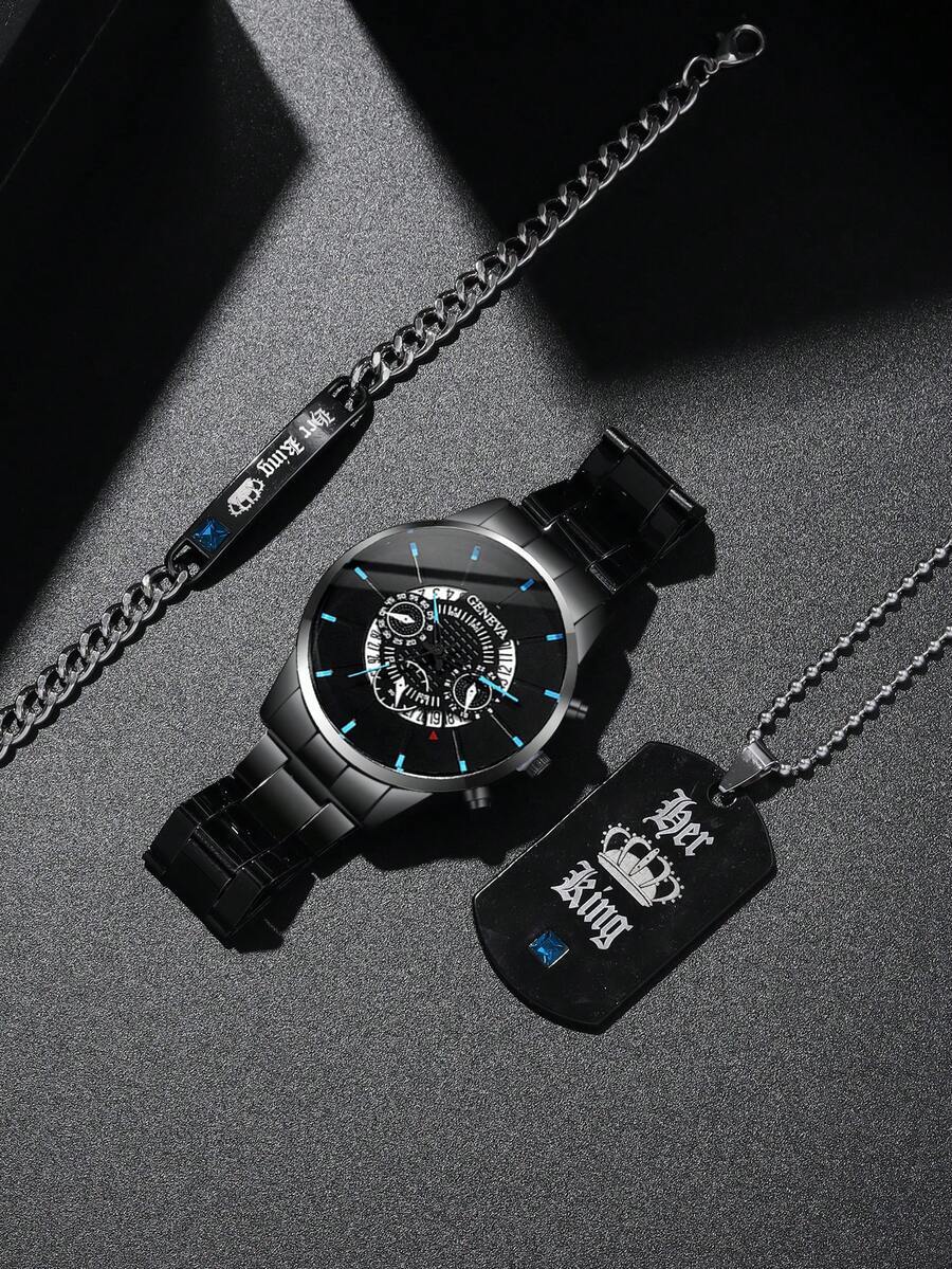 - 腕時計 メンズ セット ステンレス鋼クォーツ メンズ腕時計 チェーンブレスレット ペンダントネックレス 3点セット、男の子への最高