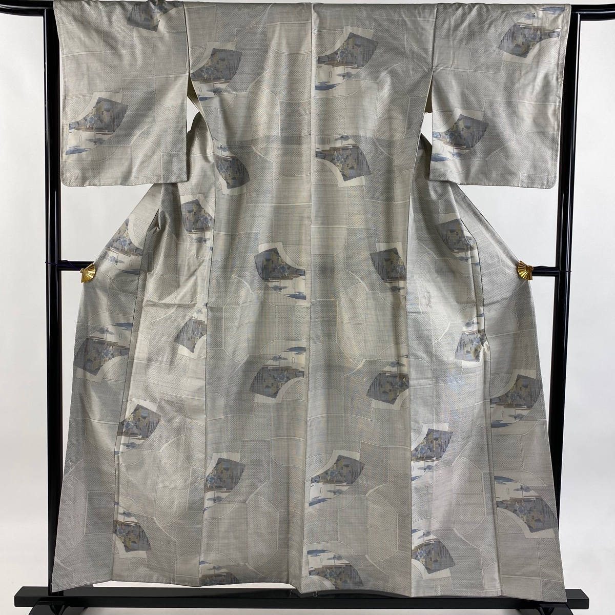 - 大島紬 身丈157.5cm 裄丈63.5cm S 袷 都喜ヱ門 証紙 扇面 幾何学 灰色 正絹 逸品 【中古】