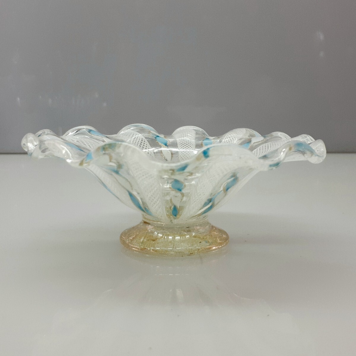 > 【 MURANO 】ITALY★ムラノ 金彩 水色リボン レース コンポート ★ヴェネチアン グラス ムラーノ ベネチアン ガラス