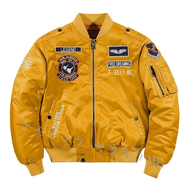 - 新品☆大ジャケットメンズおしゃれフライトジャケットMA-1春秋冬防風防寒中綿入りコートジャンパー立ち襟刺繍イエローM~3XL
