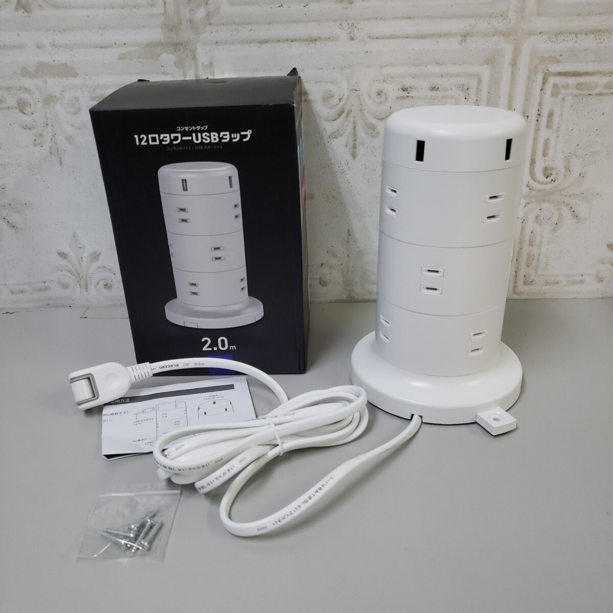 > 711y1008★エレコム 電源タップ タワー型 延長コード [ 12個口 & USB×5ポート ] 固定パーツ付 2m ホワイト ECT-0720WH