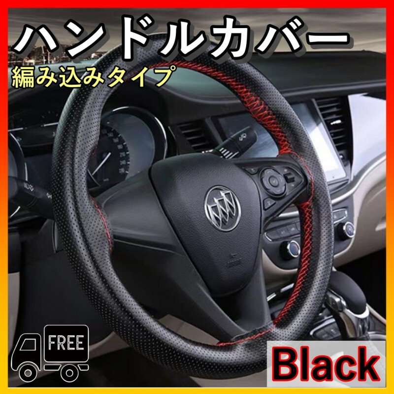 - ハンドルカバー PUレザー 編み込み ステアリングカバー 黒 本革風 手縫