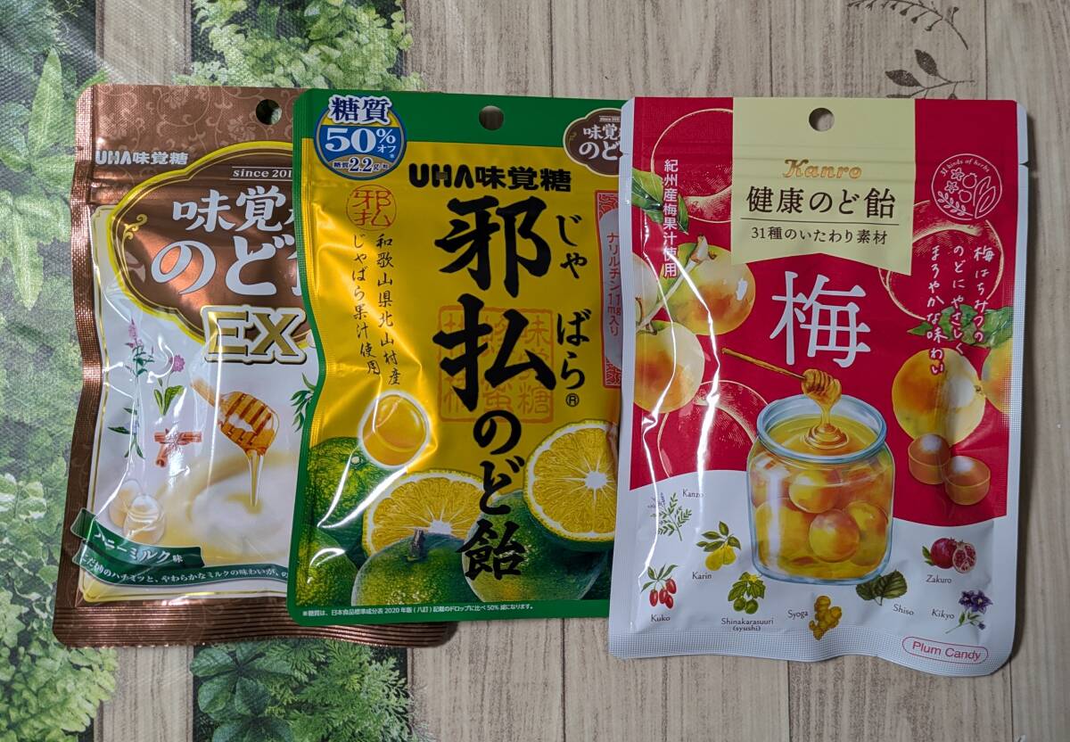 - のど飴3種各1個 味覚糖のど飴EX ・ 味覚糖 邪払のど飴 ・ Kanro 健康のど飴 梅