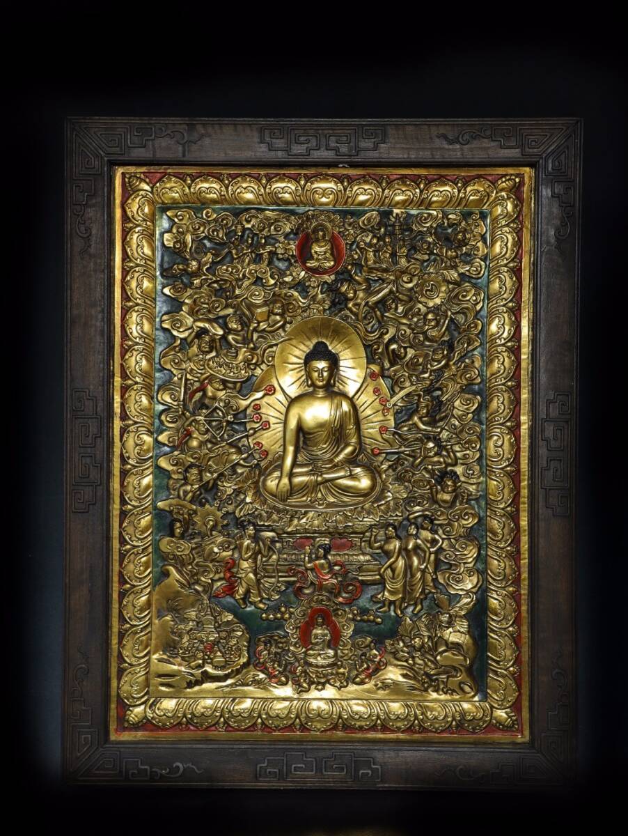 - 永し 明時代 木框嵌銅 紫銅塗金 鏨刻彫 釋迦牟尼佛 掛屏 宗教 仏教古美術 極細工 古銅彫 置物擺件 古美術品 古董品 収集 旧家蔵出 中国唐物