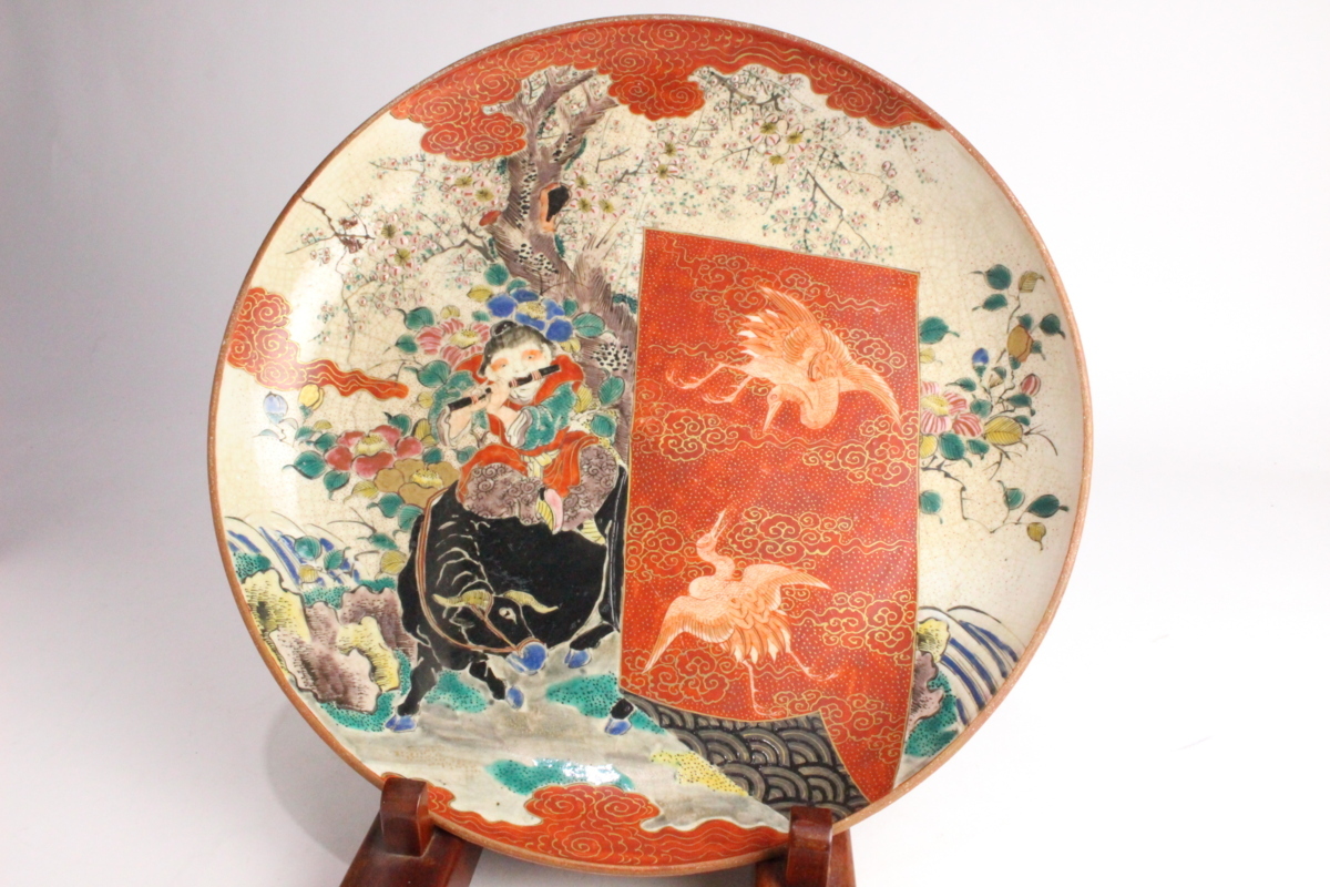 後年の作品に、割模様に文様に諸色で描き余白部を赤地金彩とする作品が見られ、その号は「九谷旭山」