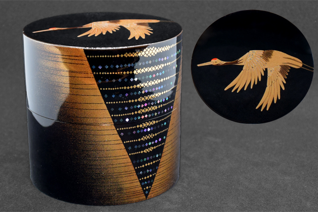 - 茶道具 加賀蒔絵 井筒英文 鶴蒔絵 内銀地 棗 青貝螺鈿