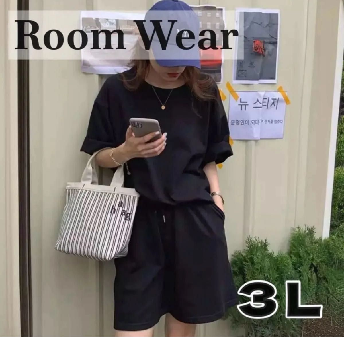 - ルームウェア 部屋着 セットアップ 楽チン 半袖 短パン カジュアル ゆったり パジャマ上下 ブラック 3L