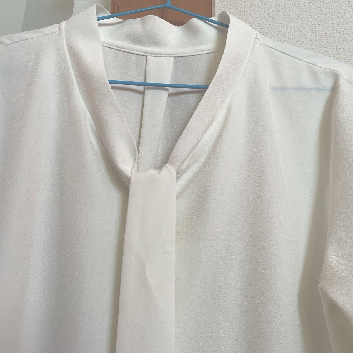- 2way長袖ブラウス リボン ボウタイ 白 オフホワイト LLサイズ 大きい イージーケア アイロン不要