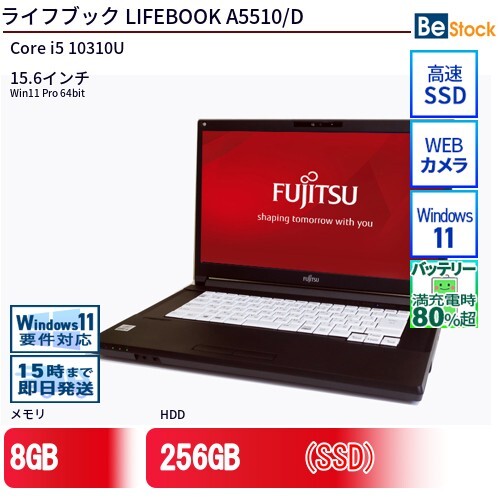 > 中古 ノートパソコン 富士通 LIFEBOOK A5510/D Core i5 256GB Win11 15.6型 SSD搭載 ランクB 動作A 6ヶ月保証