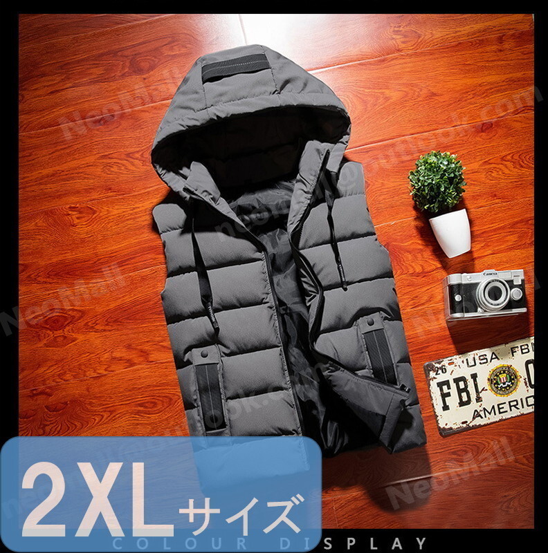 > フードが外せる メンズ ダウンベスト 001 グレー 2XLサイズ 中綿ダウン 中綿ベスト キルティング アウター 防寒 秋冬 暖かい
