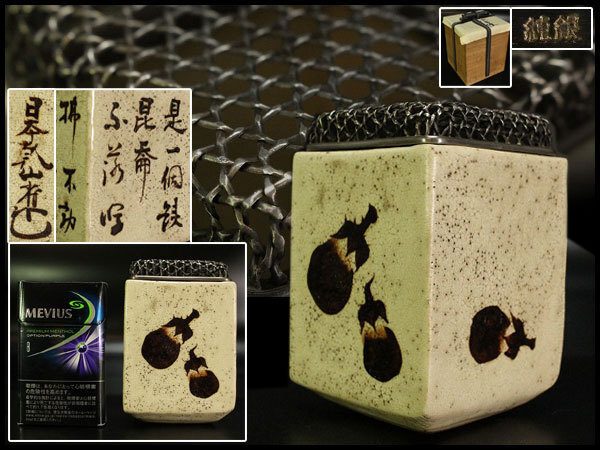 > 【金閣】京名工 尾形乾山 在銘 茄子図 四方 香炉 純銀火舎 八雲 在銘 刻印有 7cmx7cm 高10.7cm 時代箱 旧家蔵出 送料無料(ME720)