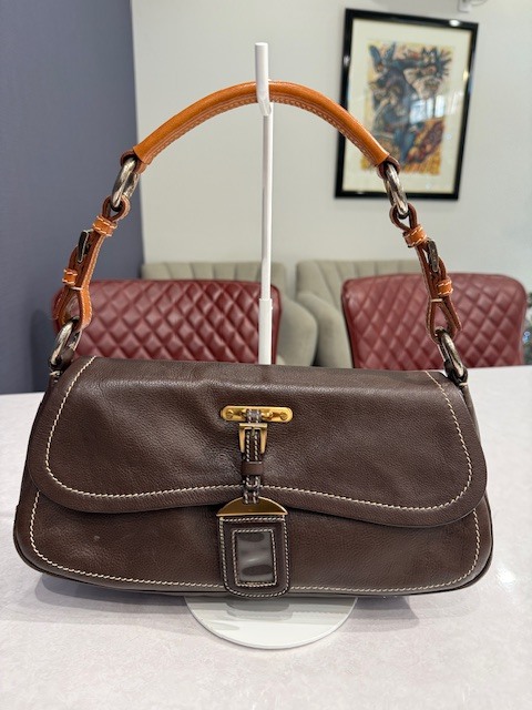 > ●H7-11-99 プラダ PRADA ハンドバッグ ワンショルダー レザー 三角ロゴプレート こげ茶色 ダークブラウン BR2428 箱付き