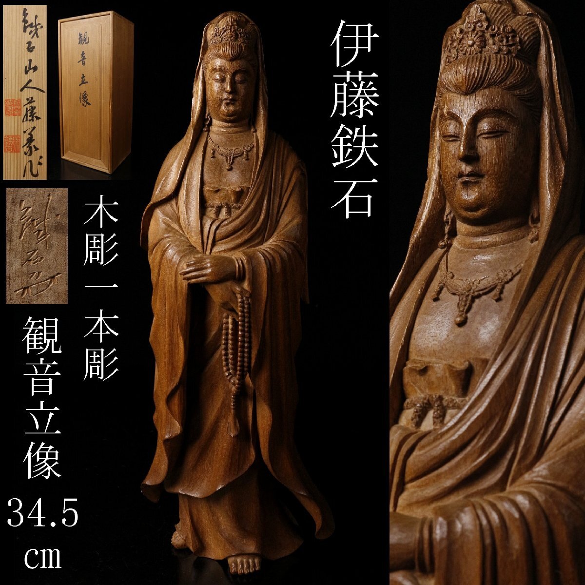 - 【LIG】本物保証 伊藤鉄石 鉄石山人藤義 木彫 一本彫 観音立像 34.5㎝ 細密彫刻 共箱 仏教美術 [.EE]25.11